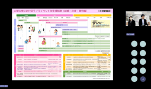 今回は「結婚・出産・育児・介護に関する支援制度」をテーマに、人事課職員からの説明を聞きました。人事課作成の「ライフイベント別図解」を画面共有しながら、本学で受けられる各支援制度の内容や、相談窓口についての説明がありました。また質疑応答では、会場参加者、オンライン参加者ともに質問があり、和気あいあいと充実した時間を過ごすことができました。