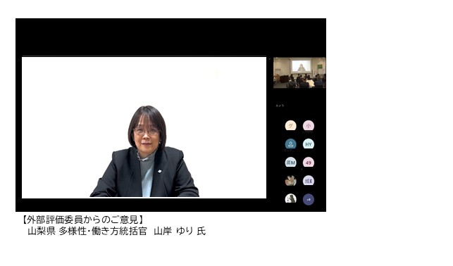 報告会の最後には、全体を通してJST山村康子プログラム主管から講評をいただき、「山梨大学が共同実施機関と連携して行った取り組みは、具体的かつ緻密であり、他の機関にも参考になるものであった」と高く評価されました。また、「山梨県全体への取り組みの普及促進が重要であり、女性研究者・技術者の育成や帰属意識の醸成が地域産業の発展に繋がること、そして今日得られた知見が山梨地域や日本全体の女性研究者・技術者の活躍推進に役立つものとなるよう、事業終了後も連携の継続を期待する」と講評が締めくくられました。