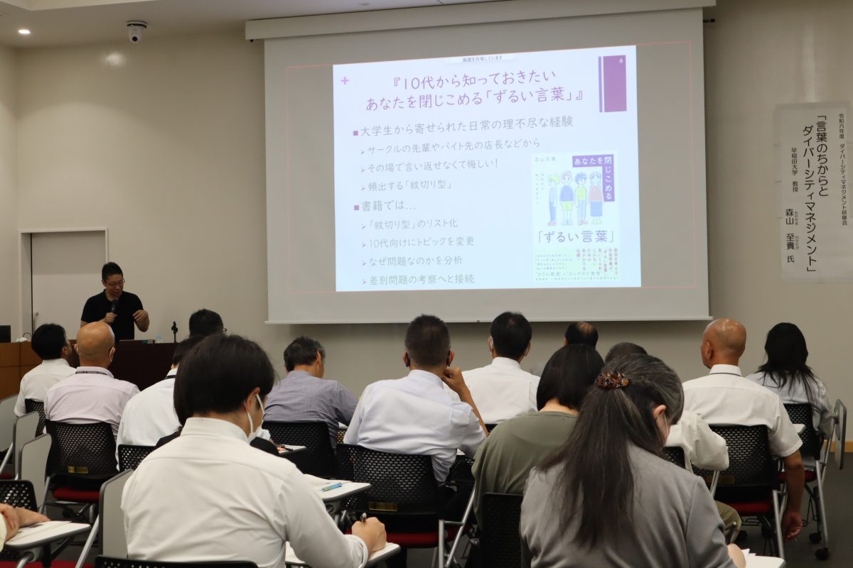 今回の研修会は、早稲田大学文学学術院教授の森山至貴(もりやまのりたか)氏をお招きし、「言葉のちからとダイバーシティマネジメント」と題してご講演いただきました。