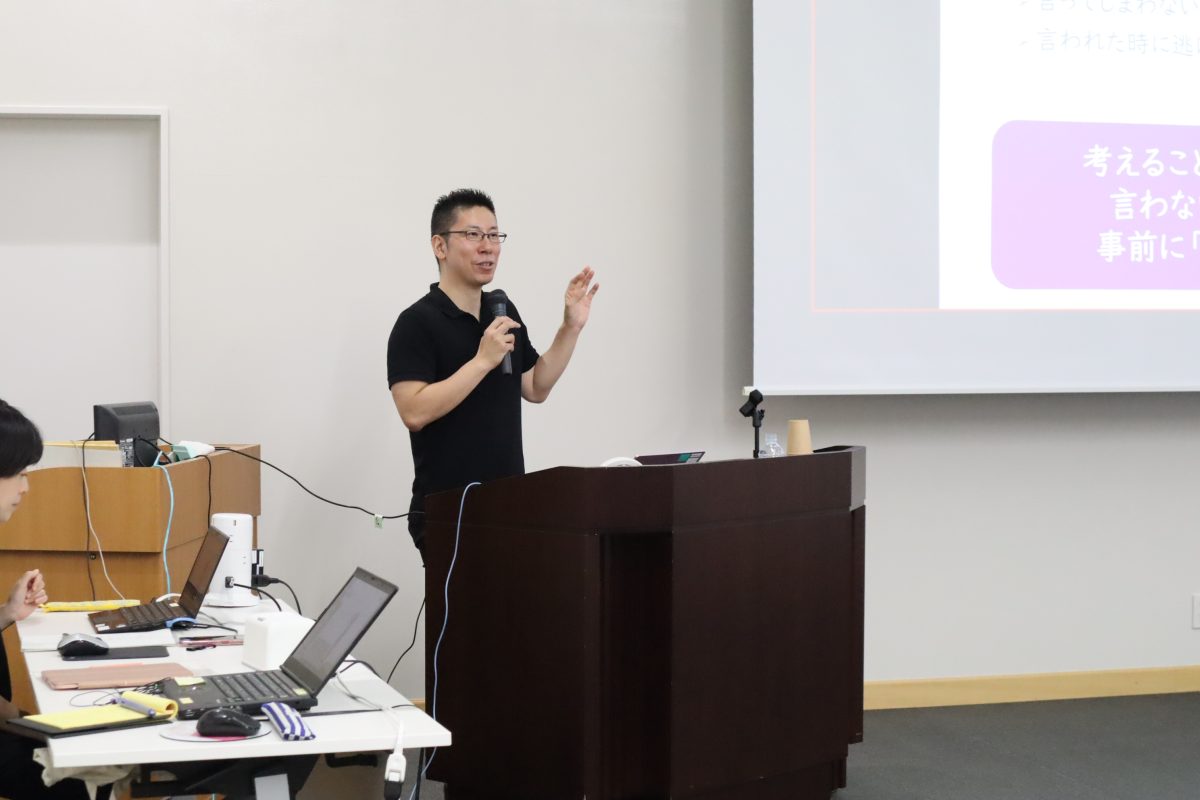 講演では、「ずるい言葉」の定義とその背景にある問題点を多くの例を挙げて説明していただきました。職場でのコミュニケーションを改善するためには、異なる属性を持つ人々が生み出す権力差に敏感であることが必要であると指摘されました。また、職場環境の中で、平等でないものがある場合、マネジメント側がマネジメントされる側を(説得という方法ではなく)言葉の力(「ずるい言葉」)を使って誘導することを避け、より平等なコミュニケーションを目指す必要性を強調されました。