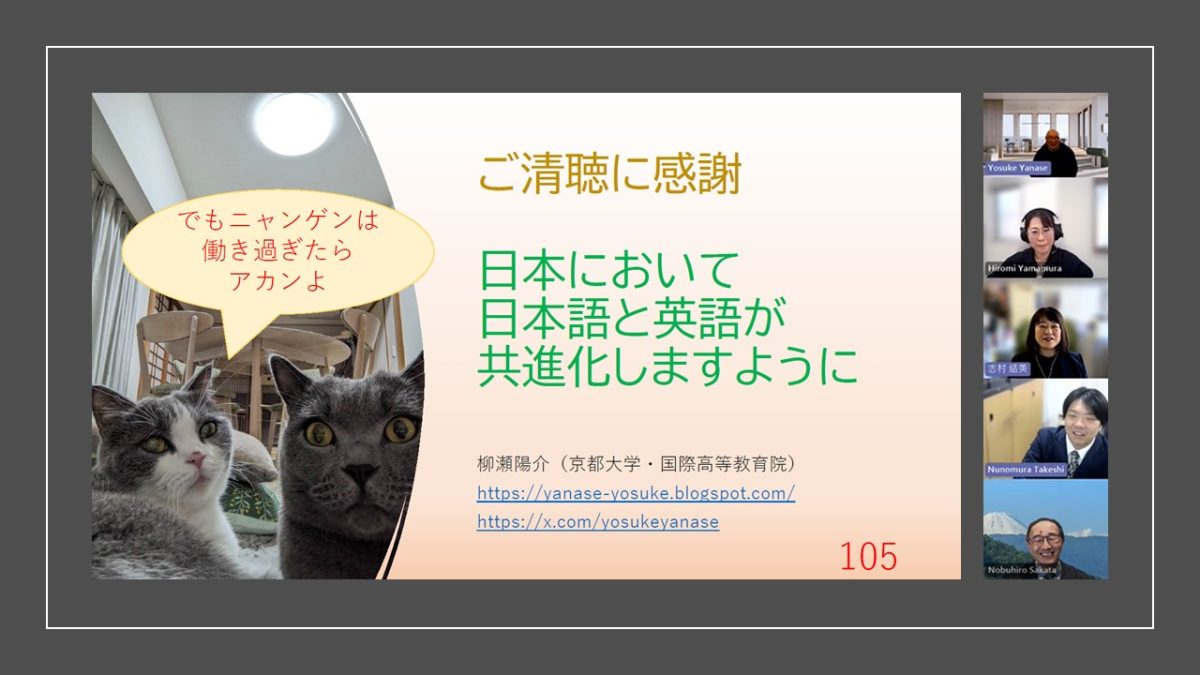 講師に京都大学 国際高等教育院 附属国際学術言語教育センター 柳瀬陽介 教授をお招きしました。講義では、AI は人間の力を拡張するツールであることを前提とし、英語論文を作成する際に、日本語話者が気を付けなければならない点について、事例を用いて説明いただきました。また、最新の生成 AI についての紹介とともに、「英語学習」のツールとし