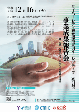 令和2年度に本事業に採択されて以来、山梨大学、シミックホールディングス株式会社、株式会社はくばくの三機関が連携し、地域におけるダイバーシティ環境の推進を牽引すべく、さまざまな取り組みを進めてまいりました。今年度は、これまでの活動の集大成となる最終年度を迎えております。 本報告会では、三機関が協力して取り組んできた活動内容をご報告するとともに、今後の地域社会とのさらなる連携強化や、ダイバーシティ推進に向けた展望について共有する場としたいと考えております。 多くの方の参加を心よりお待ちしております。