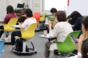 ワークでは、男女の行動特性上の性差に、組織あるいは女性本人としてどのように対応すればよいかを個人で考え、さらにグループで意見を出し合いました。さらに、性差が不利になりにくい4つのリーダーシップ(変革型・協同型・奉仕型・包摂型)について学び、どのタイプのリーダーシップに興味があるか、どんなリーダーになってみたいか等、グループディスカッションを行ったあと、全体で共有しました。